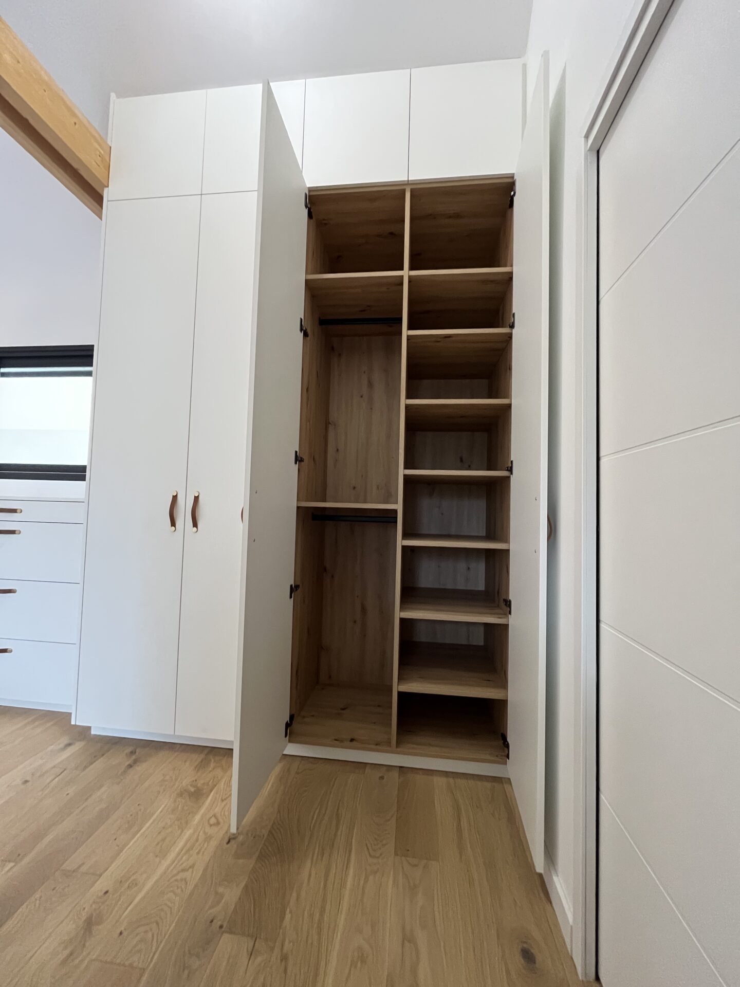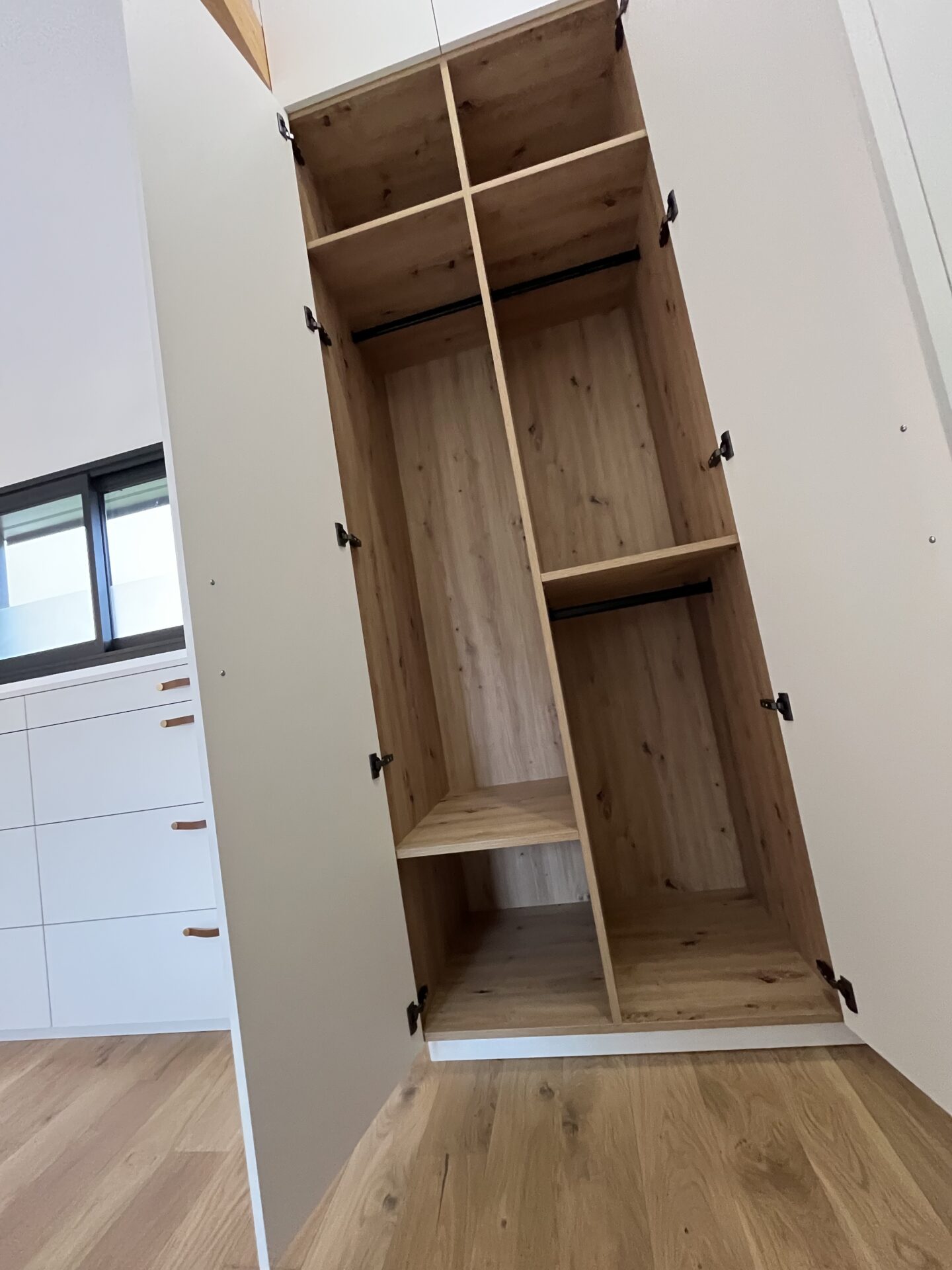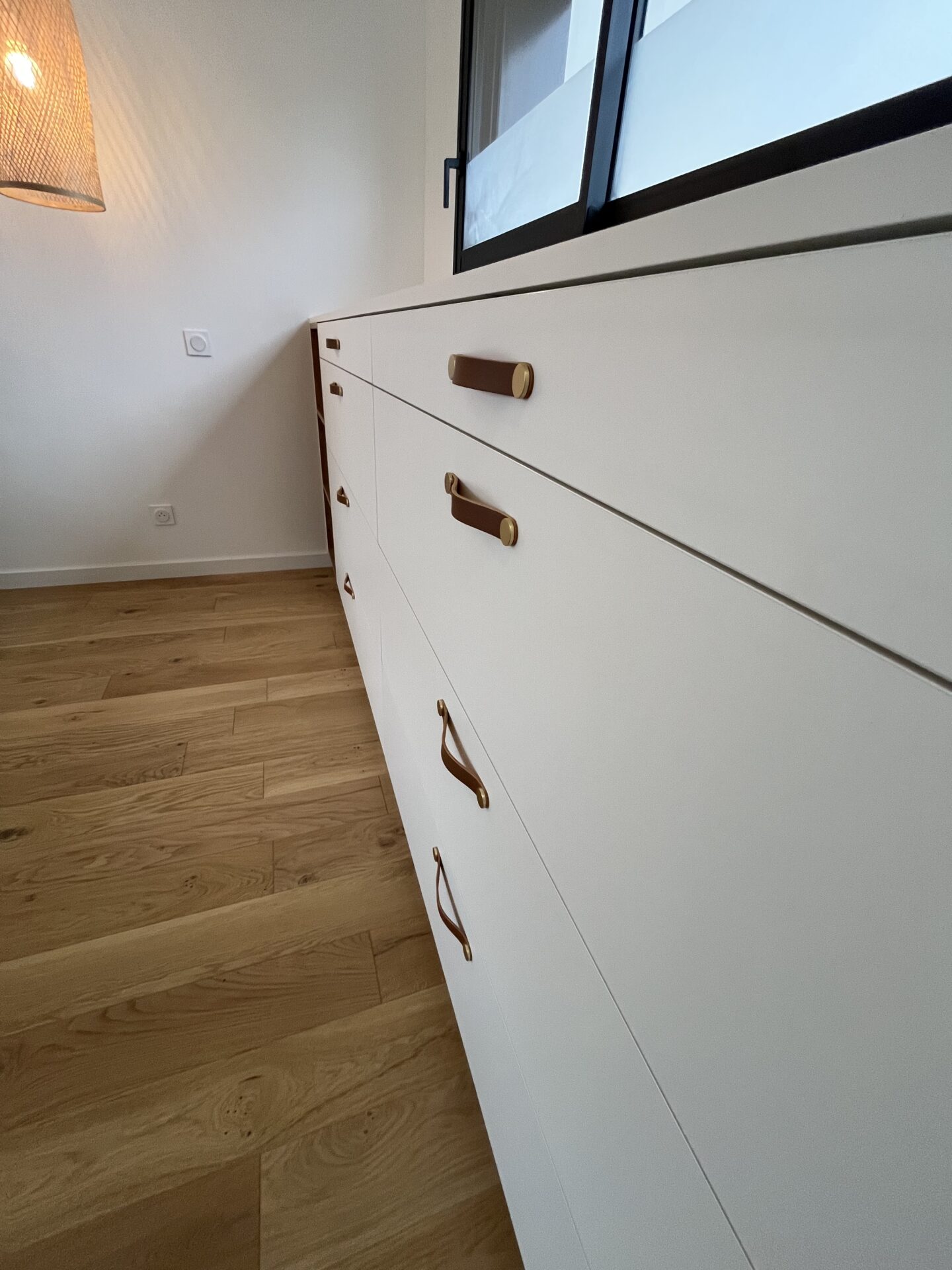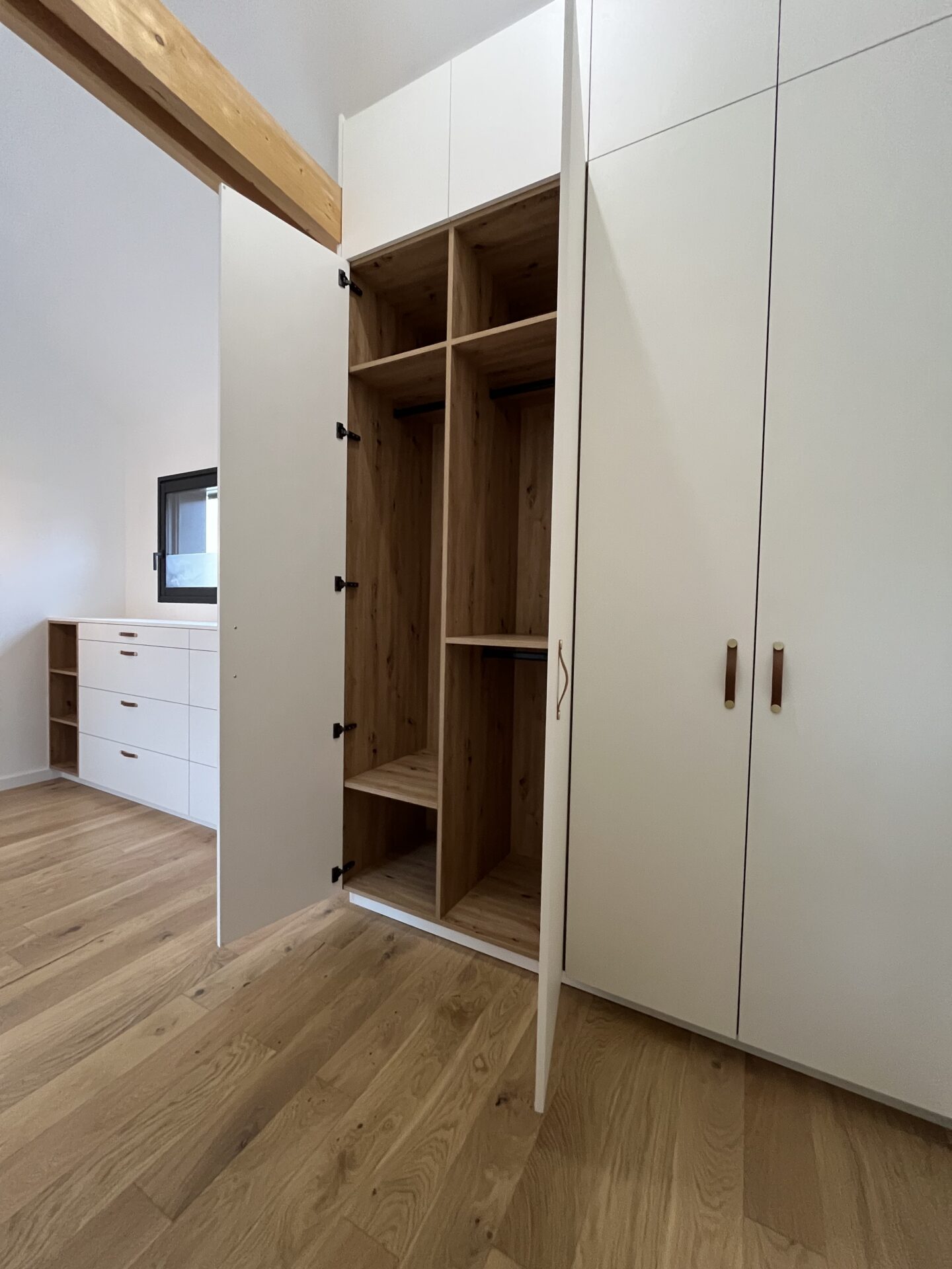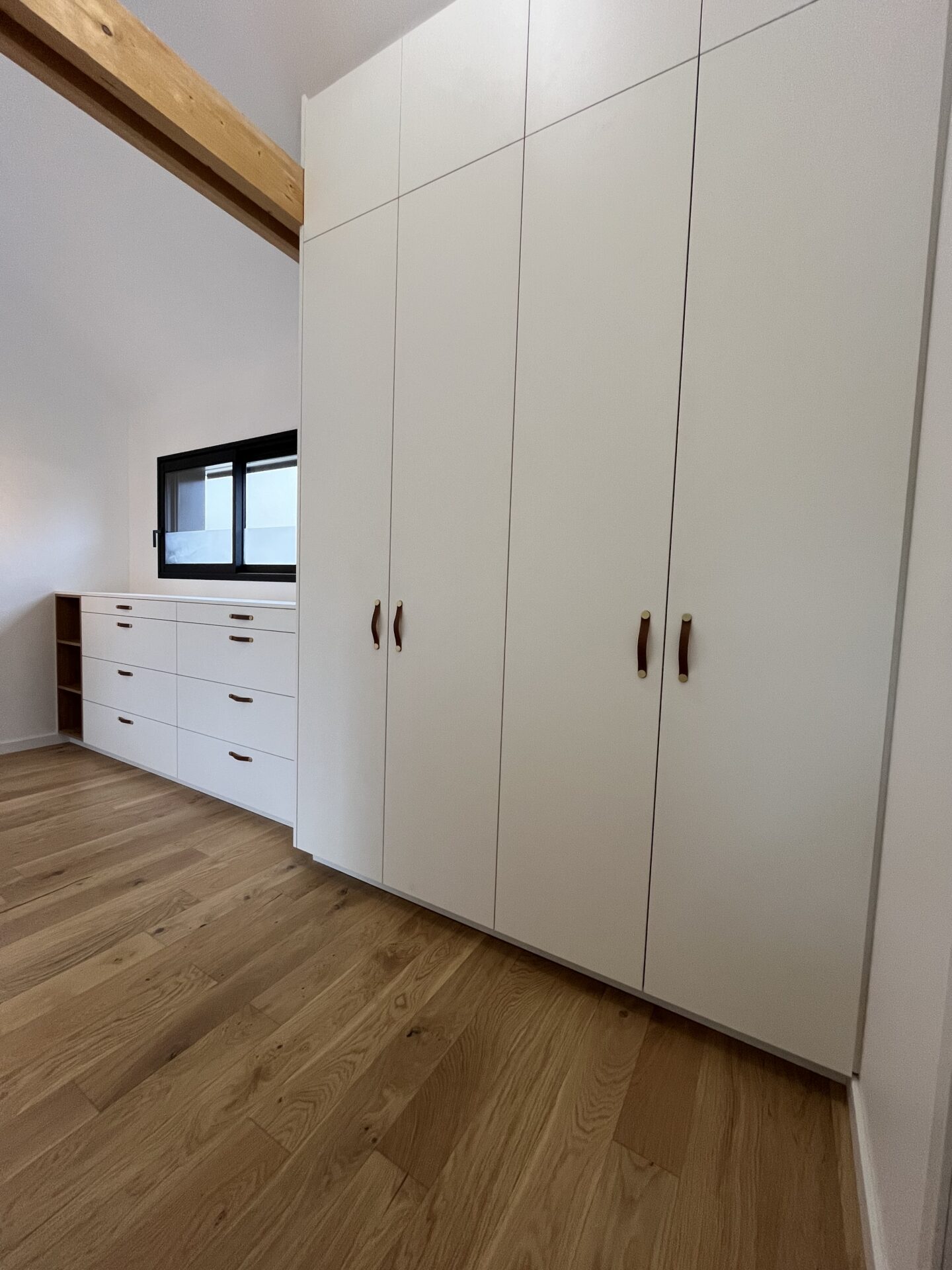 Pour ce projet, l’entreprise APC, située à Campbon, a conçu et réalisé un placard sur mesure multifonction, parfaitement intégré à l’espace existant et optimisé jusque dans les moindres détails.