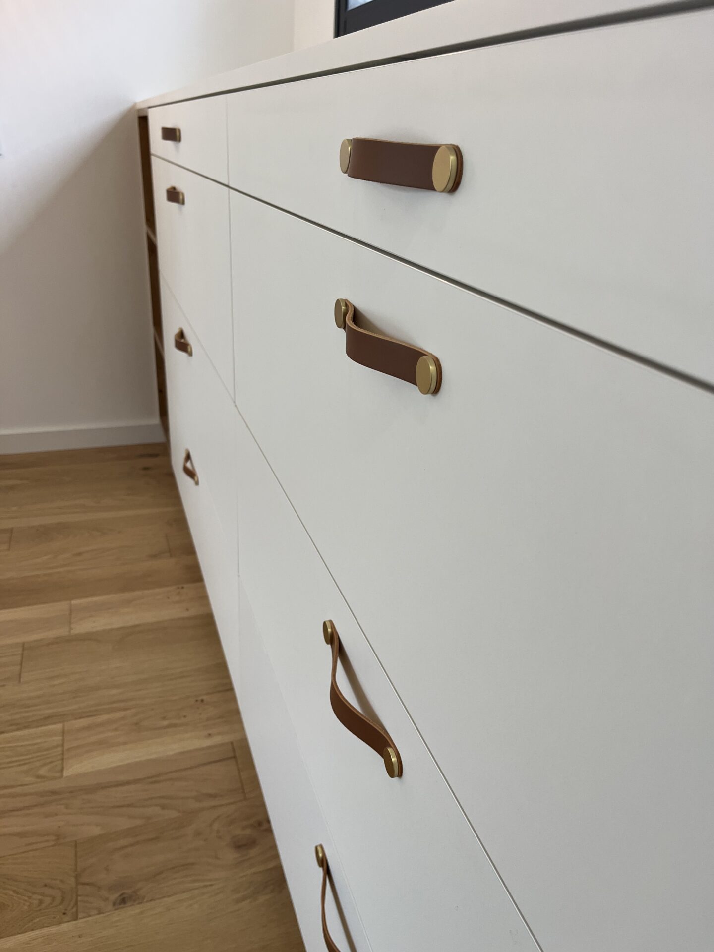 Les poignées en cuir, à la fois élégantes et confortables, soulignent le caractère artisanal de la réalisation et ajoutent un détail raffiné qui fait toute la différence.
